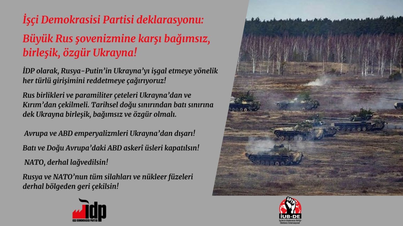 İşçi Demokrasisi Partisi’nin, bugün (24 Şubat) “Rusya-Putin’in Ukrayna’yı işgal etmeye yönelik her türlü girişimini reddetmeye çağırıyoruz” diyerek yayınladığı deklarasyonu paylaşıyoruz: