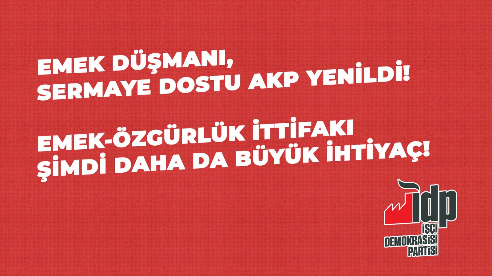 İşçi Demokrasisi Partisi olarak seçimlere giden yolda ve öncesinde de bir emek ittifakının çağrısında bulunduk. Bu emek ittifakının var olamadığı koşullarda da Türkiye İşçi Partisi ile sürdürdüğümüz işbirliği çerçevesinde Manisa ve İstanbul’un çeşitli ilçelerinde “Emekçiler Yönetmeli” şiarıyla emekçi adaylarımızla aktif bir seçim kampanyası yürüttük. Kürt illerinde DEM ve diğer illerde ise başta TİP olmak üzere emekten yana, sosyalist adaylara oy çağrısında bulunduk.