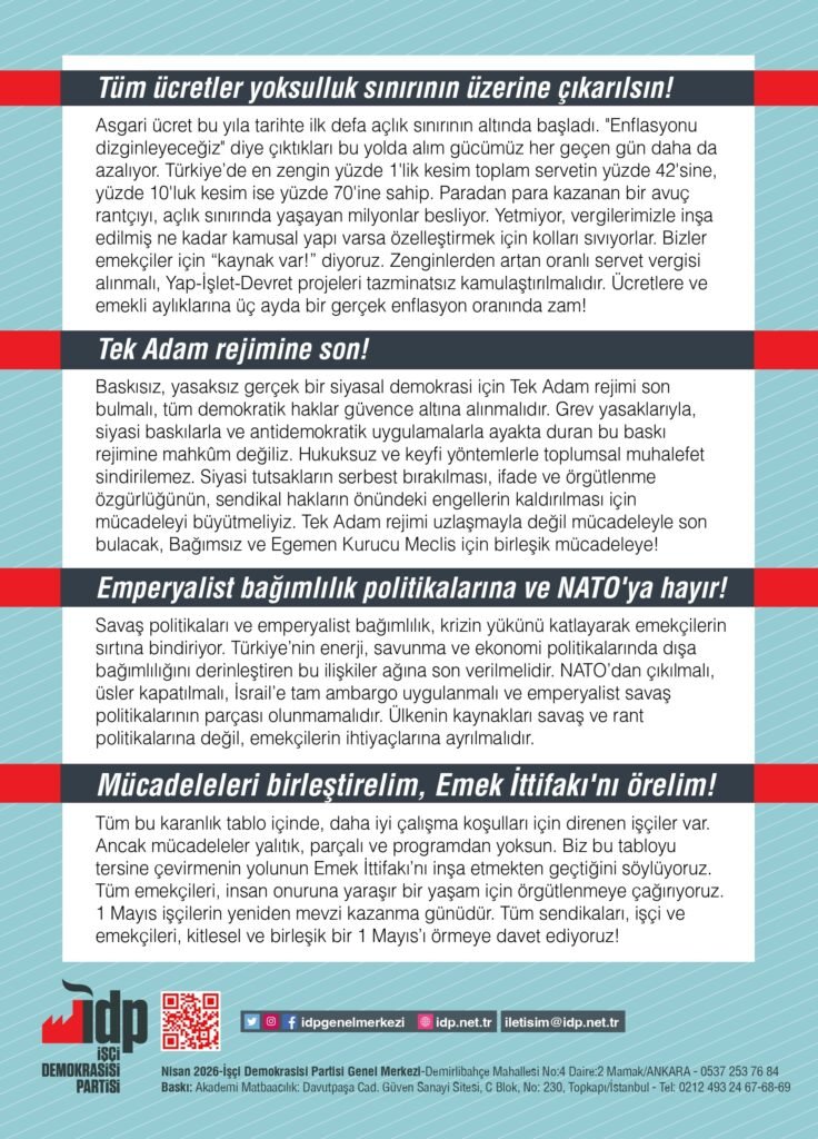 Tüm bu karanlık tablo içinde, daha iyi çalışma koşulları için direnen işçiler var. Ancak mücadeleler yalıtık, parçalı ve programdan yoksun. İşçi Demokrasisi Partisi olarak bu tabloyu tersine çevirmenin yolunun Emek İttifakı’nı inşa etmekten geçtiğini söylüyoruz. Tüm emekçileri, insan onuruna yaraşır bir yaşam için örgütlenmeye çağırıyoruz. 1 Mayıs işçilerin yeniden mevzi kazanma günüdür. Tüm sendikaları, işçi ve emekçileri, kitlesel ve birleşik bir 1 Mayıs’ı örmeye davet ediyoruz!