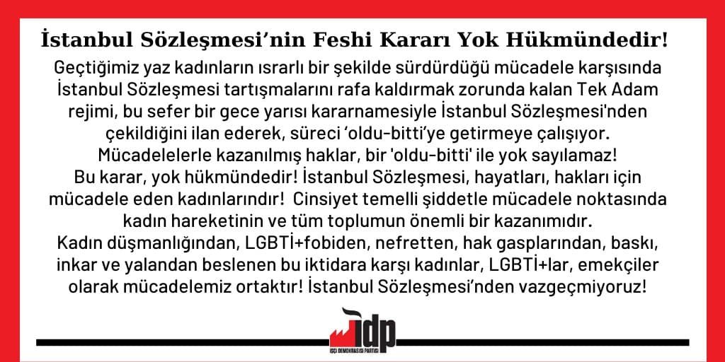 Kadın düşmanlığından, LGBTİ+fobiden, nefretten, hak gasplarından, baskı, inkar ve yalandan beslenen bu iktidara karşı kadınlar, LGBTİ+lar, emekçiler olarak mücadelemiz ortaktır! İstanbul Sözleşmesi’nden vazgeçmiyoruz!