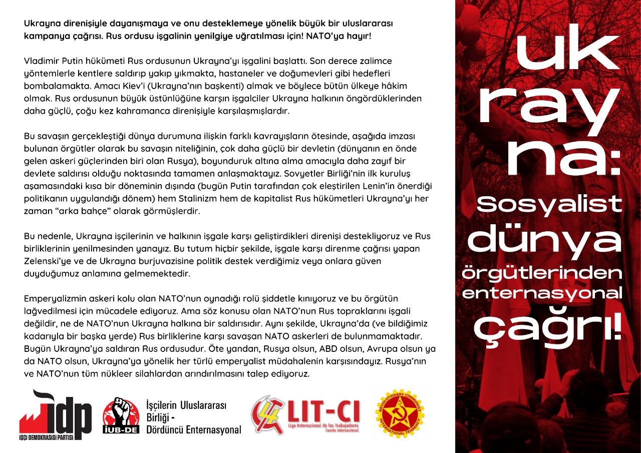 Ukrayna direnişiyle dayanışmaya ve onu desteklemeye yönelik büyük bir uluslararası kampanya çağrısı. Rus ordusu işgalinin yenilgiye uğratılması için! NATO’ya hayır!
